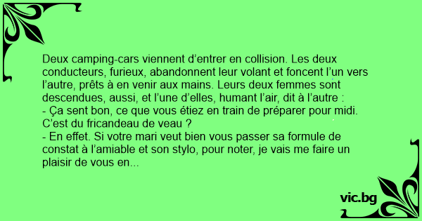 Deux camping-cars viennent d’entrer en collision. Les deux conducteurs, furieux, abandonnent leur volant et foncent l’un vers l’autre, prêts à en venir aux mains. Leurs deux femmes sont descendues, aussi, et l’une d’elles, humant l’air, dit à l’autre :