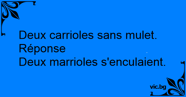 Deux carrioles sans mulet.<br />Réponse<br />Deux marrioles s'enculaient.