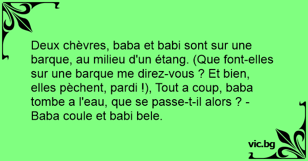 Deux chèvres, baba et babi sont sur une barque, au milieu d'un étang. (Que font-elles sur une barque me direz-vous ? Et bien, elles pèchent, pardi !), Tout a coup, baba tombe a l'eau, que se passe-t-il alors ? -Baba coule et babi bele.