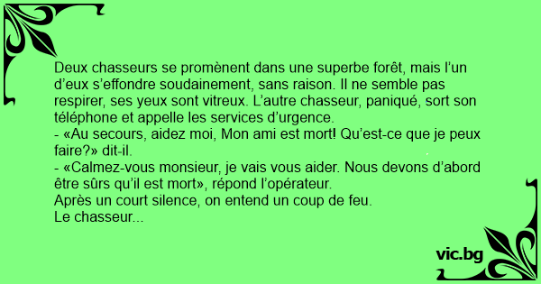 Deux chasseurs se promènent dans une superbe forêt, mais l’un d’eux s’effondre soudainement, sans raison. Il ne semble pas respirer, ses yeux sont vitreux. L’autre chasseur, paniqué, sort son téléphone et appelle les services d’urgence.