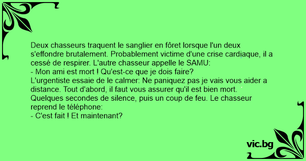 Deux chasseurs avancent dans un bois quand soudain, l’un des 2 s’effondre. Il ne bouge plus, ne respire plus. Son compagnon sort son portable, appelle les urgences et hurle : “Mon copain est tombé,...