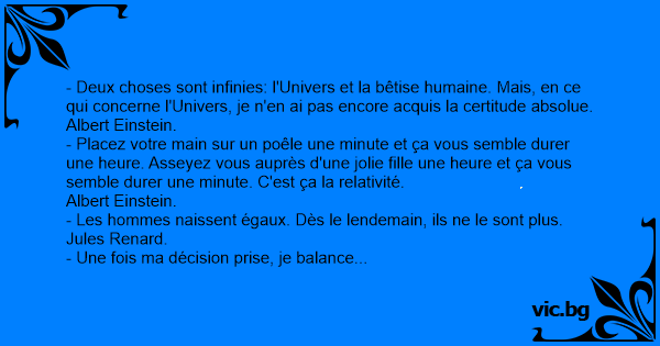 - Deux choses sont infinies: l'Univers et la bêtise humaine. Mais, en ce qui concerne l'Univers, je n'en ai pas encore acquis la certitude absolue.