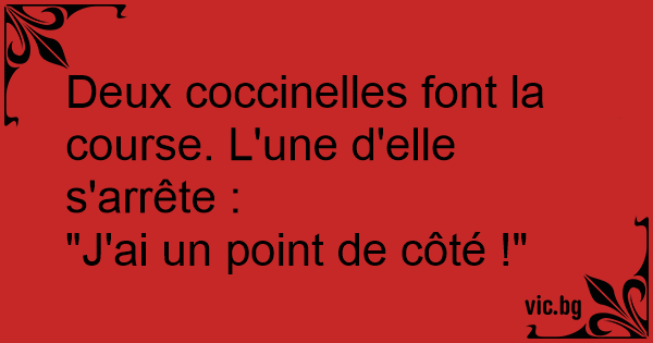 Deux coccinelles font la course. L'une d'elle s'arrête :<br />"J'ai un point de côté !"