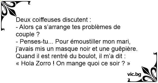 - Penses-tu... Pour émoustiller mon mari, j’avais mis un masque noir et une guêpière. Quand il est rentré du boulot, il m’a dit :