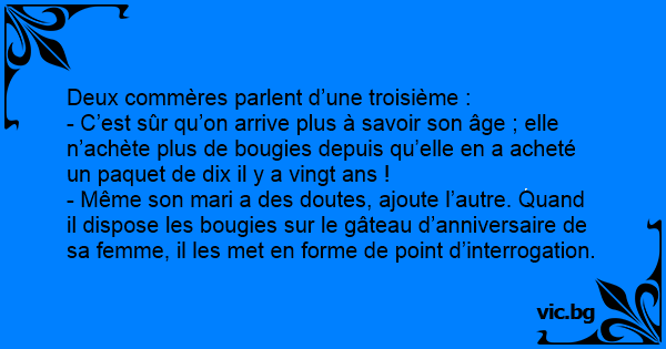 - C’est sûr qu’on arrive plus à savoir son âge ; elle n’achète plus de bougies depuis qu’elle en a acheté un paquet de dix il y a vingt ans !