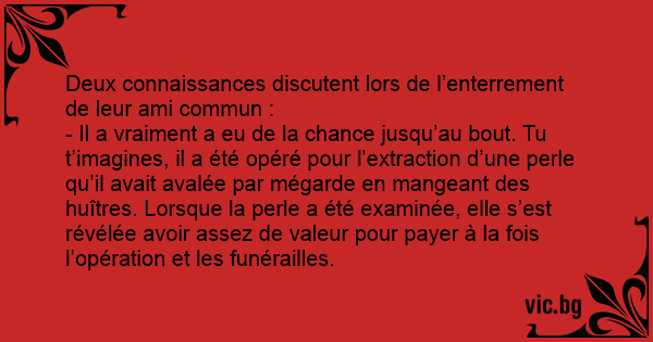 - Il a vraiment a eu de la chance jusqu’au bout. Tu t’imagines, il a été opéré pour l’extraction d’une perle qu’il avait avalée par mégarde en mangeant des huîtres. Lorsque la perle a été examinée, elle s’est révélée avoir assez de valeur pour payer à la fois l’opération et les funérailles.
