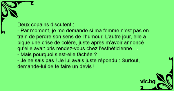 - Par moment, je me demande si ma femme n’est pas en train de perdre son sens de l’humour. L’autre jour, elle a piqué une crise de colère, juste après m’avoir annoncé qu’elle avait pris rendez-vous chez l’esthéticienne.