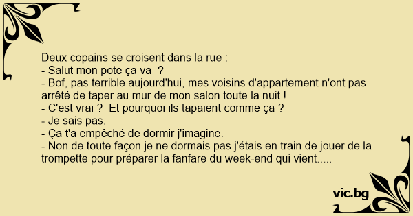 - Non de toute façon je ne dormais pas j'étais en train de jouer de la trompette pour préparer la fanfare du week-end qui vient.....