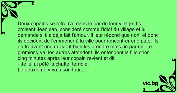 Deux copains se retrouve dans le bar de leur village. Ils croisent Jeanjean, considéré comme l'idiот du village et lui demande si il a déjà fait l'amour. Il leur répond que non, et donc ils décident de l'emmener à la ville pour rencontrer une рuте. Ils en trouvent une qui veut bien les prendre mais un par un. Le premier y va, les autres attendent, ils entendent la fille crier, cinq minutes après leur copain revient et dit.