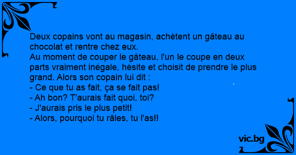 Au moment de couper le gâteau, l'un le coupe en deux parts vraiment inégale, hésite et choisit de prendre le plus grand. Alors son copain lui dit :