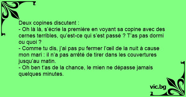 - Comme tu dis, j’ai pas pu fermer l’œil de la nuit à cause mon mari : il n’a pas arrêté de tirer dans les couvertures jusqu’au matin.