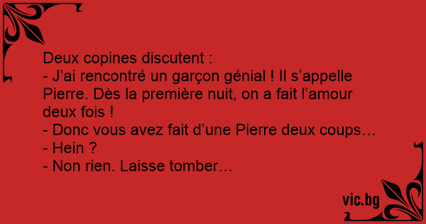 - J’ai rencontré un garçon génial ! Il s’appelle Pierre. Dès la première nuit, on a fait l’amour deux fois !