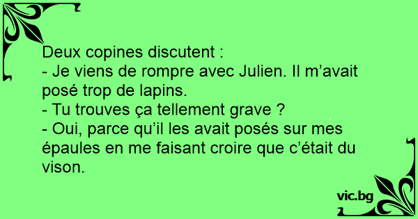 - Je viens de rompre avec Julien. Il m’avait posé trop de lapins.