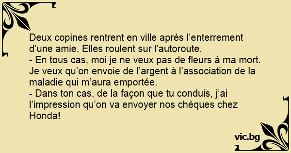 - En tous cas, moi je ne veux pas de fleurs à ma mort. Je veux qu’on envoie de l’argent à l’association de la maladie qui m’aura emportée.