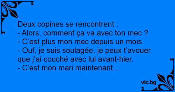 - Ouf, je suis soulagée, je peux t’avouer que j’ai couché avec lui avant-hier.