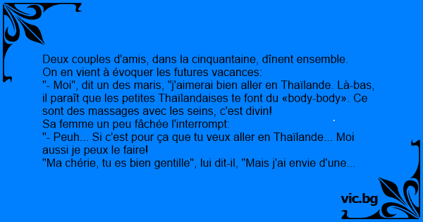"- Moi", dit un des maris, "j'aimerai bien aller en Thaïlande. Là-bas, il paraît que les petites Thaïlandaises te font du «body-body». Ce sont des massages avec les seins, c'est divin!