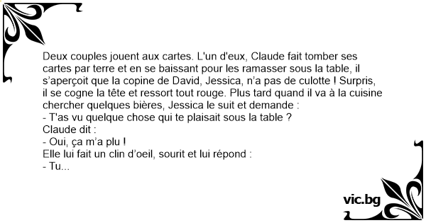 Deux couples jouent aux cartes. L'un d'eux, Claude fait tomber ses cartes par terre et en se baissant pour les ramasser sous la table, il s’aperçoit que la copine de David, Jessica, n’a pas de culotte ! Surpris, il se cogne la tête et ressort tout rouge. Plus таrd quand il va à la cuisine chercher quelques bières, Jessica le suit et demande :