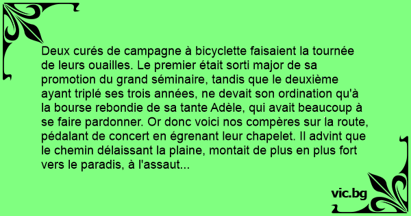 Deux curés de campagne à bicyclette faisaient la tournée de leurs ouailles. Le premier était sorti major de sa promotion du grand séminaire, tandis que le deuxième ayant triplé ses trois années, ne devait son ordination qu'à la bourse rebondie de sa tante Adèle, qui avait beaucoup à se faire pardonner. Or donc voici nos compères sur la route, pédalant de concert en égrenant leur chapelet. Il advint que le chemin délaissant la plaine, montait de plus en plus fort vers le paradis, à l'assaut d'un col de première catégorie.