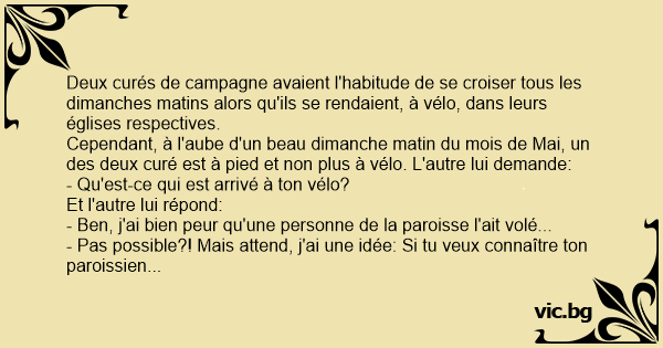 Deux curés de campagne avaient l'habitude de se croiser tous les dimanches matins alors qu'ils se rendaient, à vélo, dans leurs églises respectives.