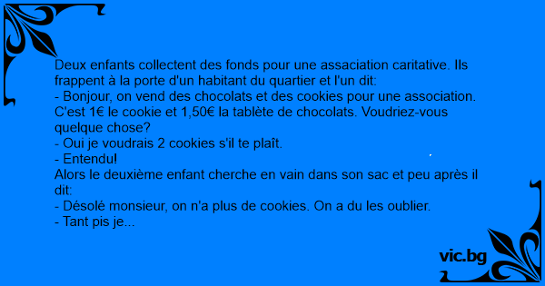 - Bon, si c'est pour une association, j'accepte de vous donner 3€ mais la prochaine fois que vous venez, vous me vendrez vos friandises à -50%, d'accord?