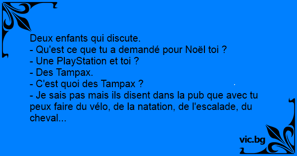 Deux jeunes enfants à l'école pendant la récréation. - T'as demandé quoi pour Noël ? - Un Tampax. - C'est quoi ça ? - Je sais pas, mais avec tu peux faire du cheval, de la gym, du vélo...