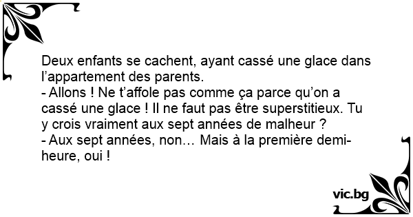 - Allons ! Ne t’affole pas comme ça parce qu’on a cassé une glace ! Il ne faut pas être superstitieux. Tu y crois vraiment aux sept années de malheur ?