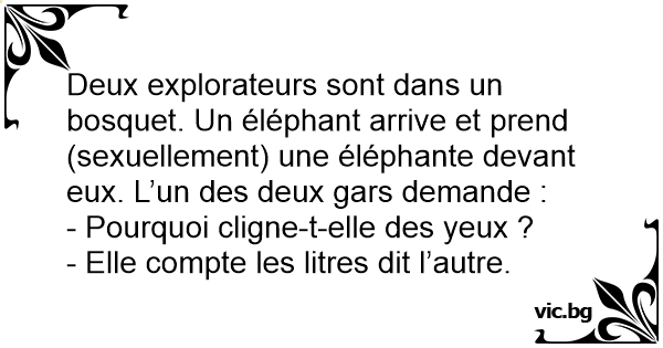 Deux explorateurs sont dans un bosquet. Un éléphant arrive et prend (sexuellement) une éléphante devant eux. L’un des deux gars demande :