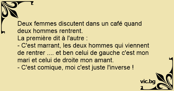 - C'est marrant, les deux hommes qui viennent de rentrer .... et ben celui de gauche c'est mon mari et celui de droite mon amant.