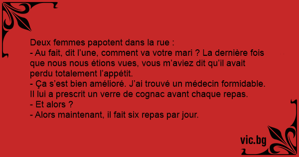 - Au fait, dit l’une, comment va votre mari ? La dernière fois que nous nous étions vues, vous m’aviez dit qu’il avait perdu totalement l’appétit.
