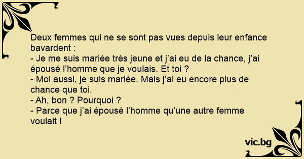 - Moi aussi, je suis mariée. Mais j’ai eu encore plus de chance que toi.