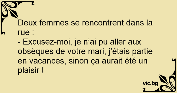 - Excusez-moi, je n’ai pu aller aux obsèques de votre mari, j’étais partie en vacances, sinon ça aurait été un plaisir !