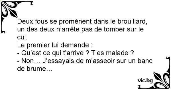 Deux fous se promènent dans le brouillard, un des deux n’arrête pas de tomber sur le cul.