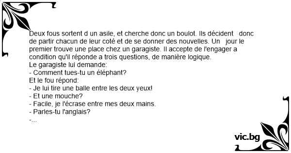 Deux fous sortent d un asile, et cherche donc un boulot. Ils décident donc de partir chacun de leur coté et de se donner des nouvelles. Un jour le premier trouve une place chez un garagiste. Il accepte de l'engager a condition qu'il réponde a trois questions, de manière logique.