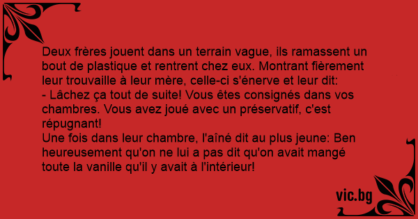 Une fois dans leur chambre, l'aîné dit au plus jeune: Ben heureusement qu'on ne lui a pas dit qu'on avait mangé toute la vanille qu'il y avait à l'intérieur!