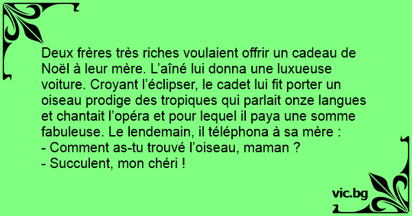 Deux frères très riches voulaient offrir un cadeau de Noël à leur mère. L’aîné lui donna une luxueuse voiture. Croyant l’éclipser, le cadet lui fit porter un oiseau prodige des tropiques qui parlait onze langues et chantait l’opéra et pour lequel il paya une somme fabuleuse. Le lendemain, il téléphona à sa mère :