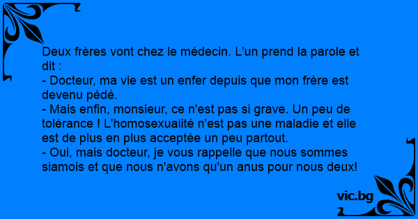 - Oui, mais docteur, je vous rappelle que nous sommes siamois et que nous n'avons qu'un аnus pour nous deux!