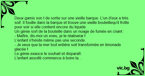 Deux gamis son t de sortie sur une vieille barque. L'un d'eux a très soif. Il fouille dans la barque et trouve une vieille bouteillequ'il frotte pour voir si elle contient encore du liquide.