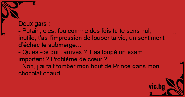 - Рuтаin, c’est fou comme des fois tu te sens nul, inutile, t’as l’impression de louper ta vie, un sentiment d’échec te submerge…
