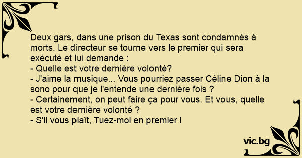 Deux gars, dans une prison du Texas sont condamnés à morts. Le directeur se tourne vers le premier qui sera exécuté et lui demande :
