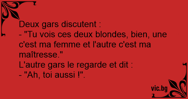 - "Tu vois ces deux blondes, bien, une c'est ma femme et l'autre c'est ma maîtresse."