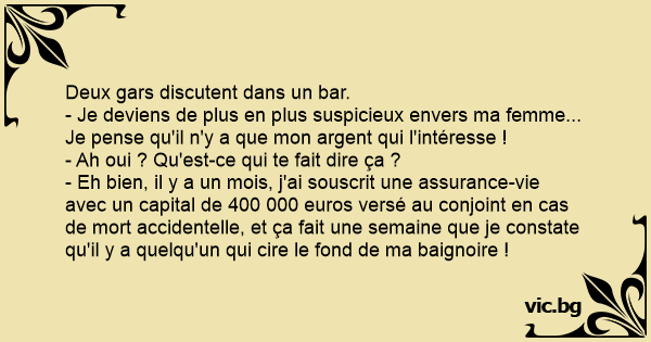 - Eh bien, il y a un mois, j'ai souscrit une assurance-vie avec un capital de 400 000 euros versé au conjoint en cas de mort accidentelle, et ça fait une semaine que je constate qu'il y a quelqu'un qui cire le fond de ma baignoire !