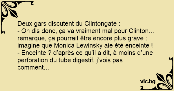 - Oh dis donc, ça va vraiment mal pour Clinton… remarque, ça pourrait être encore plus grave : imagine que Monica Lewinsky aie été enceinte !