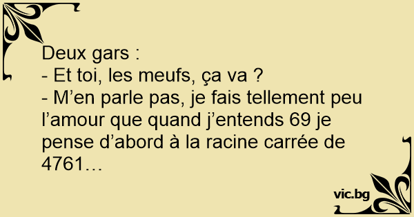 - M’en parle pas, je fais tellement peu l’amour que quand j’entends 69 je pense d’abord à la racine carrée de 4761…