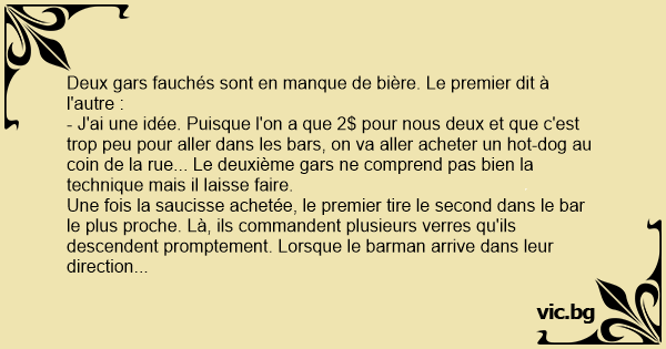 - J'ai une idée. Puisque l'on a que 2$ pour nous deux et que c'est trop peu pour aller dans les bars, on va aller acheter un hot-dog au coin de la rue... Le deuxième gars ne comprend pas bien la technique mais il laisse faire.