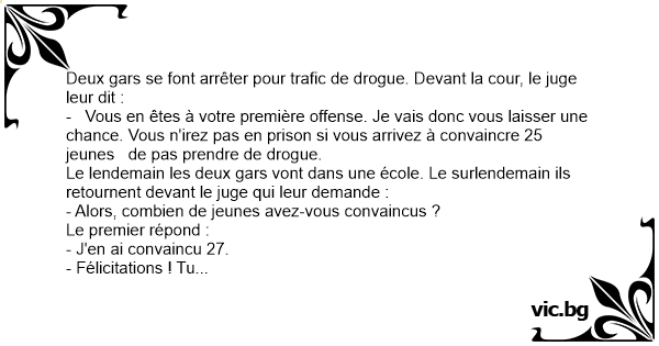 Deux gars se font arrêter pour trafic de drogue. Devant la cour, le juge leur dit :