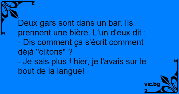 Το ξεμάτιασμα Джейк: Un enfant rentre de l'école et demande à son père : - Papa, comment ça s'écrit clitoris? - Tu aurais du me demander hier soir car je l'avais au bout de la langue. Jantje vraagt aan zijn vader “Vader, wat is een clitoris?” Waarop zijn vader antwoordt “Dat had je me gisteren moeten vragen Jantje, toen lag het op het puntje van mijn tong” O filho aborda o pai antes de ele sair para trabalhar para que lhe satisfaça uma curiosidade: — Papai, me explica uma coisa. — O que foi, filho? Pode perguntar. — Papai, o que é clitóris? — Poxa,... Pappa, Pappa, hva er klitoris? - Du skulle spurt meg i går for da hadde jeg det på tungen... - Papa, ¿Qué es el clitorix? - Hijo, si me lo hubieses preguntado anoche, lo tenía en la punta de la lengua. Jantje komt bij zijn vader met de vraag: - ” Papa, wat is een clitorus? ” Zegt zijn vader:  “Had je gisteravond bij me moeten komen, toen lag het op mijn puntje van me tong!” Lille Kurt kommer en til sin far. - "Far! Hvad er en klitoris? " - Årh! For pokker knægt, du skulle have spurgt igår, da jeg det lige på tungen!!!!! Un compadre le habla por teléfono a su compadre, le dice: - Compadre ¿cómo se escribe "****" con "c" o con "k"? Y le responde el compadre: - Me hubiera hablado anoche... lo tenía en la punta de la... - Papa comment s'écrit clitoris ? - Tu aurais dû me dire hier, je l'avais sur le bout de la langue... C'est deux gars dans un bar qui prennent une bière, y'en a un qui demande à l'autre. - Comment ça s'écrit clitoris. - L'autre lui répond : Tu aurais dû me le demander hier,je l'avais sur le bout de... Toto demande à son père : - Dis papa, comment ça s’écrit « clitoris » ? - Et bien ,c’est une question que tu aurais dû me poser hier soir, je l’avais sur le bout de la langue… A five-year-old kid goes up to his mum and asks, “Mummy, how do you spell clitoris ? “To which his mum replies, “ask your dad, it was on the tip of his tongue last night