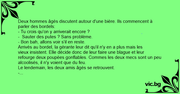 Arrivés au bordel, la gérante leur dit qu'il n'y en a plus mais les vieux insistent. Elle décide donc de leur faire une blague et leur refourge deux poupées gonflables. Commes les deux mecs sont un peu alcoolisés, il n'y voient que du feu.