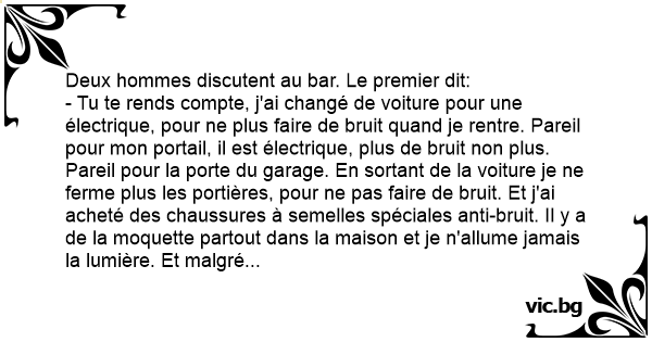 - Tu te rends compte, j'ai changé de voiture pour une électrique, pour ne plus faire de bruit quand je rentre. Pareil pour mon portail, il est électrique, plus de bruit non plus. Pareil pour la porte du garage. En sortant de la voiture je ne ferme plus les portières, pour ne pas faire de bruit. Et j'ai acheté des chaussures à semelles spéciales anti-bruit. Il y a de la moquette partout dans la maison et je n'allume jamais la lumière. Et malgré tout ça, dès que je rentre un peu таrd, ma femme se réveille et s'énerve. C'est fou non?