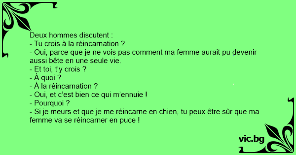 - Si je meurs et que je me réincarne en chien, tu peux être sûr que ma femme va se réincarner en puce !