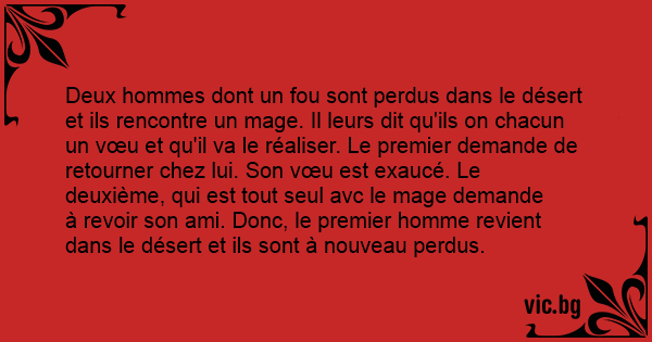 Deux hommes dont un fou sont perdus dans le désert et ils rencontre un mage. Il leurs dit qu'ils on chacun un vœu et qu'il va le réaliser. Le premier demande de retourner chez lui. Son vœu est exaucé. Le deuxième, qui est tout seul avc le mage demande à revoir son ami. Donc, le premier homme revient dans le désert et ils sont à nouveau perdus.